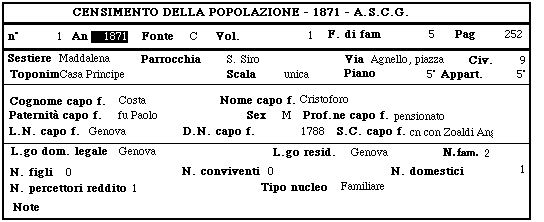 Nella pratica non si avrà più un record per ogni individuo, bensì uno per ogni foglio di famiglia, nel quale saranno contenute informazioni riguardanti prevalentemente il capo famiglia, ma anche le altre persone presenti sul foglio stesso e quindi coabitanti. Verranno quindi indicati: il numero di tutti i componenti il nucleo familiare, quello dei soli figli, quello dei conviventi non membri della famiglia (eventuali pensionanti, ospiti occasionali, etc.), quello dei componenti la servitù, nonchè il numero dei percettori di reddito (esclusi i domestici); oltre ad essere specificato se trattasi di un nucleo familiare o meno (quest'ultimo caso si ha per esempio nelle coabitazioni legate a ragioni di provenienza o di professione).