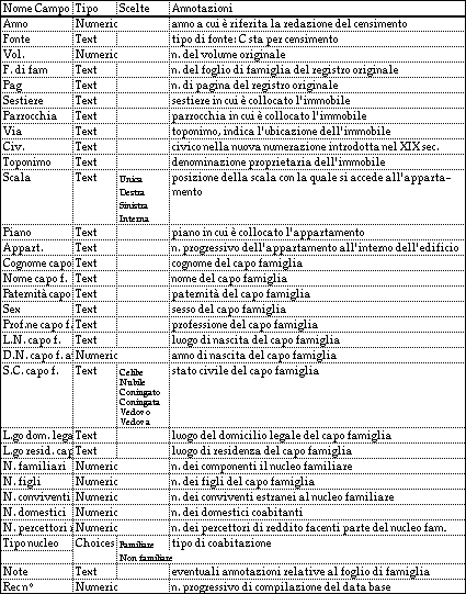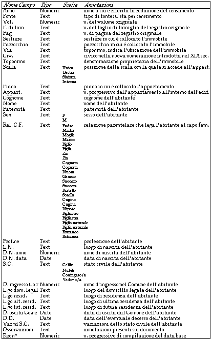 Tab. 4 - Struttura del data base per la trascrizione del censimento del 1871 (prima versione)