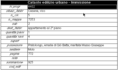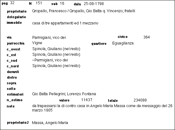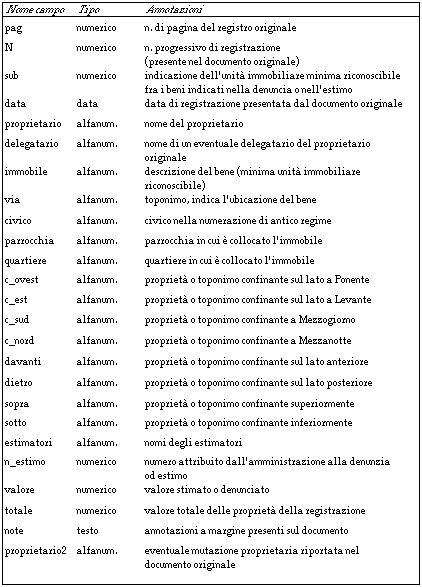 Il singolo record è stato perciò elaborato secondo uno schema in cui compaiono numerosi dati relativi all'immobile che si possono sintetizzare nelle seguenti voci: