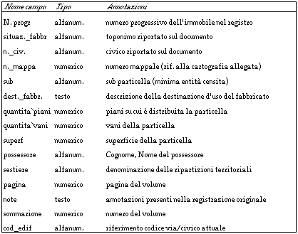 Tab. 6 - Struttura del data base per la trascrizione dei dati dal Catasto fabbricati del Regno d'Italia