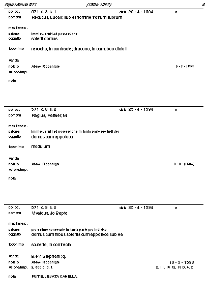 La restante parte di volumi sarà invece oggetto di una trascrizione parziale. Questa scelta è risultata dal fatto che l'originario obiettivo, costituito dalla trascrizione integrale di tutti i registri, è risultato, col procedere del lavoro, molto impegnativo in termini di tempo. Il ridimensionamento dell'impegno dedicato alla trascrizione di questo documento si è pertanto rivelato essere indispensabile onde non ostacolare l'espletamento delle altre operazioni previste nell'ambito della ricerca in corso. Nello stesso tempo il nuovo orientamento adottato nella trascrizione della fonte é tale da consentire comunque un agevole uso dei dati così informatizzati che, pur non potendo escludere, come nella prima ipotesi, il ricorso alla fonte cartacea, costituiranno tuttavia un utile ausilio alla ricerca.