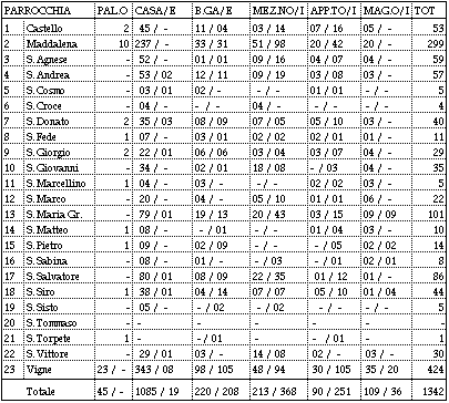 Al fine di comprendere l'effettiva consistenza dei dati, relativi agli immobi inseriti nell'Estimo del 1798, è stata realizzata una tabella in cui sono conteggiati i palazzi, le case, le botteghe, i mezzani, gli appartamenti ed i magazzini, suddivisi tra le ventitré Parrocchie della città.