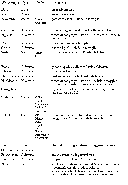 Tab. 3 - Struttura del data base per la trascrizione del Censimento del 1804