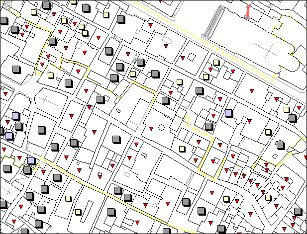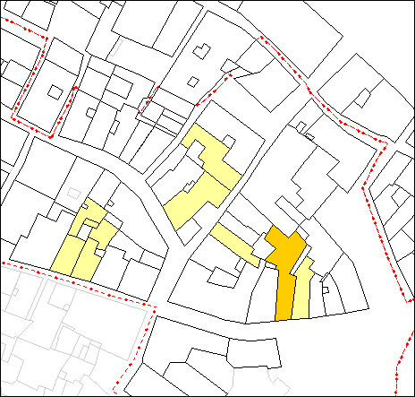 Carta dei corpi edificati: grandi lotti (in giallo) e piccoli lotti (in rosso)