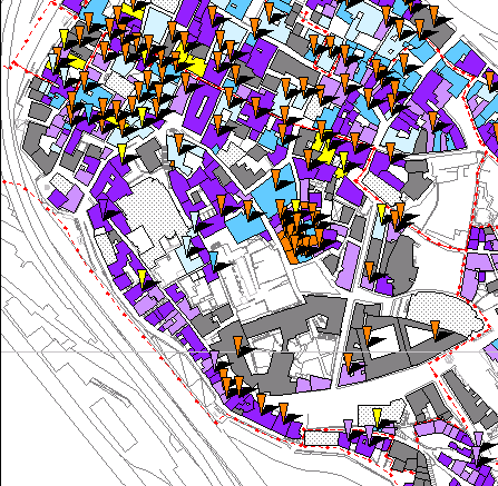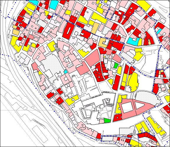 La percentuale dei corpi edificati soggetti a priorità di intervento sui problemi strutturali é soltanto il 22% del totale; sono ancora molti, é vero, ma é da considerare che i corpi maggiormente a rischio sono localizzati prevalentemente nell'area tra via Mascherona e vico Vegetti, dove dall'inizio della rilevazione ad oggi sono stati messi in atto interventi di consolidamento. Numerosi invece i problemi strutturali localizzati, a cui spesso corrisponde invece un intervento di manutenzione "esterna" (rifacimento di facciate o recupero di elementi di un certo interesse storico/archeologico): é stata quindi riscontrata una scarsa sensibilità verso problemi strutturali non gravi, ma tali da non essere trascurati, spesso mascherati da intervento di ripristino che interessano i soli paramenti murari esterni.