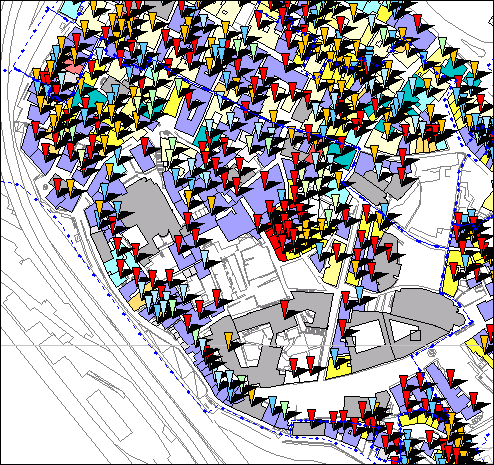 L'isolato compreso tra via Mascherona e vico Vegetti risulta composto da lotti che conservano ancora uno spazio volumetrico di chiaro taglio medioevale. Nelle immediate vicinanze si trova invece il prodotto di una importante operazione urbanistica compiuta a seguito del bombardamento del 1684: da una parte il taglio del nuovo Stradone S. Agostino, dall'altra le nuove costruzioni "da reddito" volute dagli ordini religiosi che lì avevano le loro proprietà.Tra Mura delle Grazie e via S.Croce l'immagine unitaria fornita é quella di una edilizia del XVIII/XIX secolo. Completamente diversa é la situazione tra vico dietro il Coro di S. Cosimo e via delle Grazie, caratterizzata da una edilizia che ha subito numerose trasformazioni; in corrispondenza di questa area corrisponde sulla carta una concentrazione di simboli relativi alle epoche antiquarie, simbolo delle preeesistenze individuate.