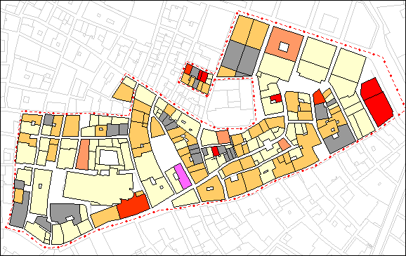 Entrando nel dettaglio ritroviamo: case d'affitto di età contemporanea attorno a piazza Lavagna; di età moderna soprattutto negli isolati lungo i Macelli di Soziglia; palazzi nobiliari negli affacci privilegiati di Luccoli e Garibaldi. Al centro riemerge l'edilizia medievale del chiostro delle Vigne.