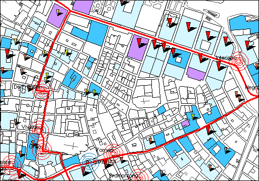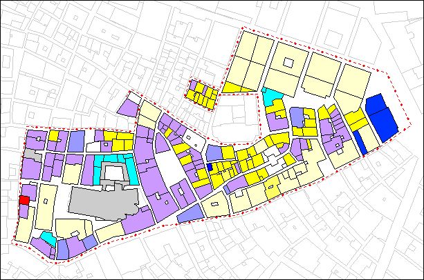 Palazzo nobiliare moderno (giallo chiaro) - casa d'affitto moderna (giallo scuro) - casa d'affitto contemporanea (viola scuro) -casa popolare moderna (azzurro)