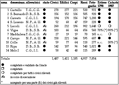 Ovviamente, tale nuova concezione, oltre a rappresentare una effettiva miglioria rispetto alla conduzione dell'indagine (raggiungendo entità di minori dimensioni), risolve le contraddizioni interne connesse alle due possibilità (civici e corpi) in precedenza indicate. L'introduzione della più minuta frammentazione rappresentata dai corpi e dagli edifici ha corrisposto ad una crescente complessità degli aspetti informatici dell'indagine che non potevano essere presentati nei semplici termini previsti dalla concezione iniziale.