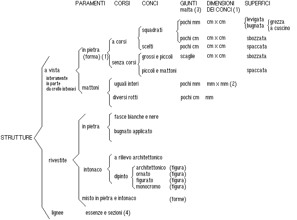 Nella relazione precedente (cfr.Rapporto preliminare, cap. 1, [[section]] 2.3) si è parlato delle osservazioni già ricavate dalle prime schede su alcuni importanti problemi del degrado dei materiali: uno dei due aspetti principali delle analisi archeologiche del costruito. La presente relazione si divide in quattro parti: 1) la prima continua sul degrado; 2) la seconda riguarda l'altro aspetto della diagnosi archeologica (cronologia e cultura materiale dei modi di costruire); 3) la terza riporta alcuni problemi sulla realizzazione degli abachi degli elementi costruttivi; 4) la quarta parte, infine, riguarda alcune considerazioni metodologiche sulle elaborazioni tematiche dei dati raccolti.