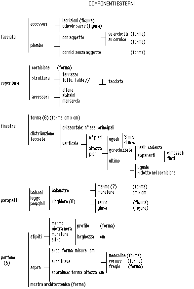 Per realizzare un abaco degli elementi costruttivi che sia utile alla conoscenza storica del costruito, ed abbia anche una funzione cronologica per la diagnosi archeologica (vedi Legge 25/87 della Regione Liguria), o per lo "sportello del Centro storico" previsto dal Progetto Civis Ambiente, non si può pensare di usare soltanto i caratteri stilistici elaborati dalla storia dell'arte, perché la maggior parte delle case del centro storico di Genova verrebbe esclusa dalla possibilità di analisi. Non è neppure possibile, per i componenti architettonici minori, e comunque privi di caratteri stilistici, di accontentarsi di valutazioni soggettive basate sull'esperienza, in quanto non ripetibili da parte di vari operatori; né di affidarsi a classificazioni idealistiche non provate da realtà storiche e archeologiche.