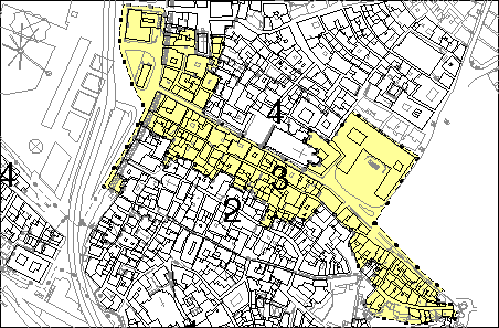 Molti sono i corpi per i quali è possibile indicare un'epoca antiquaria (il 33% di tutti quelli rilevati), e di essi ben il 26% ha un'epoca antiquaria compresa tra il 1200 ed il 1450. Essi sono ubicati soprattutto lungo l'asse di via Canneto il Lungo ed in prossimità della chiesa di S. Pietro in Banchi. Un dato importante è poi quello che riguarda la grande diffusione in questo settore di resti di portici medievali: sul numero totale dei corpi esaminati ne sono risultati dotati ben 28 (pari al 19% del totale). Questa è una importante testimonianza circa la diffusa permanenza degli oggetti della città medievale nel patrimonio edilizio attuale.