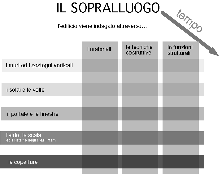 Proprio il rapporto tra storia, archeologia e indagine strutturale appare come punto di forza dell'intera operazione. Il sistema informativo pone infatti problemi di spiegazione dei fenomeni strutturali e della qualità dell'edificato, altrimenti affidati al solo giudizio di valore della critica o alle attenzioni spesso incerte della tutela. La connessione tra condizione dei materiali, documenti e trasformazioni dell'edificio consegue ad una assunzione di centralità della proprietà e delle sue strategie, rispetto ai ruoli ed alle decisioni delle pubbliche amministrazioni.
