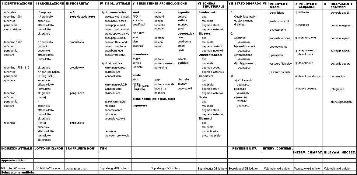 Particolarmente interessanti appaiono le assunzioni relative alla struttura del data base che, collegando dati storici e rilevazione, si incentra sulla seguente rappresentazione della natura dell'edificato.