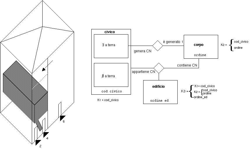 Le tecniche entity-relationship sono state infatti adattate all'analisi dell'edilizia storica privilegiando l'edilizia ottocentesca, o riproducendone la natura nella valutazione di realizzazioni precedenti. Come in tutti i casi reali la natura dell'edificio appare in questo caso tutt'altro che intuitiva. Non si tratta infatti soltanto di un oggetto definito dai suoi confini geometrici (la proiezione verticale della superficie coperta), né soltanto di un aggregato d'uso (il civico come riferimento socio-abitativo). Ma della loro integrazione. Con riferimento alla figura precedente si afferma che ciascun civico principale può dare luogo ad uno o più corpi edilizi, mentre ciascun corpo appartiene almeno ad un civico. La loro intersezione, l'"edificio" (certo non nella concezione abituale) non è soltanto una astrazione analitica, ma anche lo strumento per definire elementi uniformi anche soltanto in termini fisici.